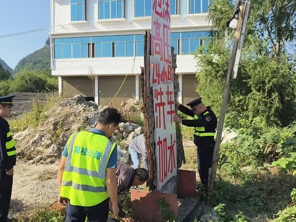 为进一步提升国道321公路整体形象,营造整齐、清静、雅观的通行情形,近期阳桂公司与市交通运输综合行政执法大队团结开展整理违法广告专项整治行动。