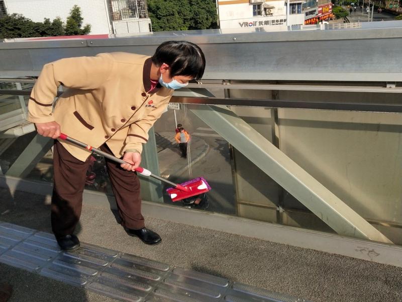 在天桥上,保洁班员工们认真整理着每一个角落,干化的口香糖和极易藏垢的通道误差也不放过。在各人的配合起劲下,人行天桥面目一新。为阻断疫情时代的细菌撒播,保洁员们还用喷药机对天桥举行了全方位消杀,辛勤支付获得了途经市民与周边住民的一致赞扬。