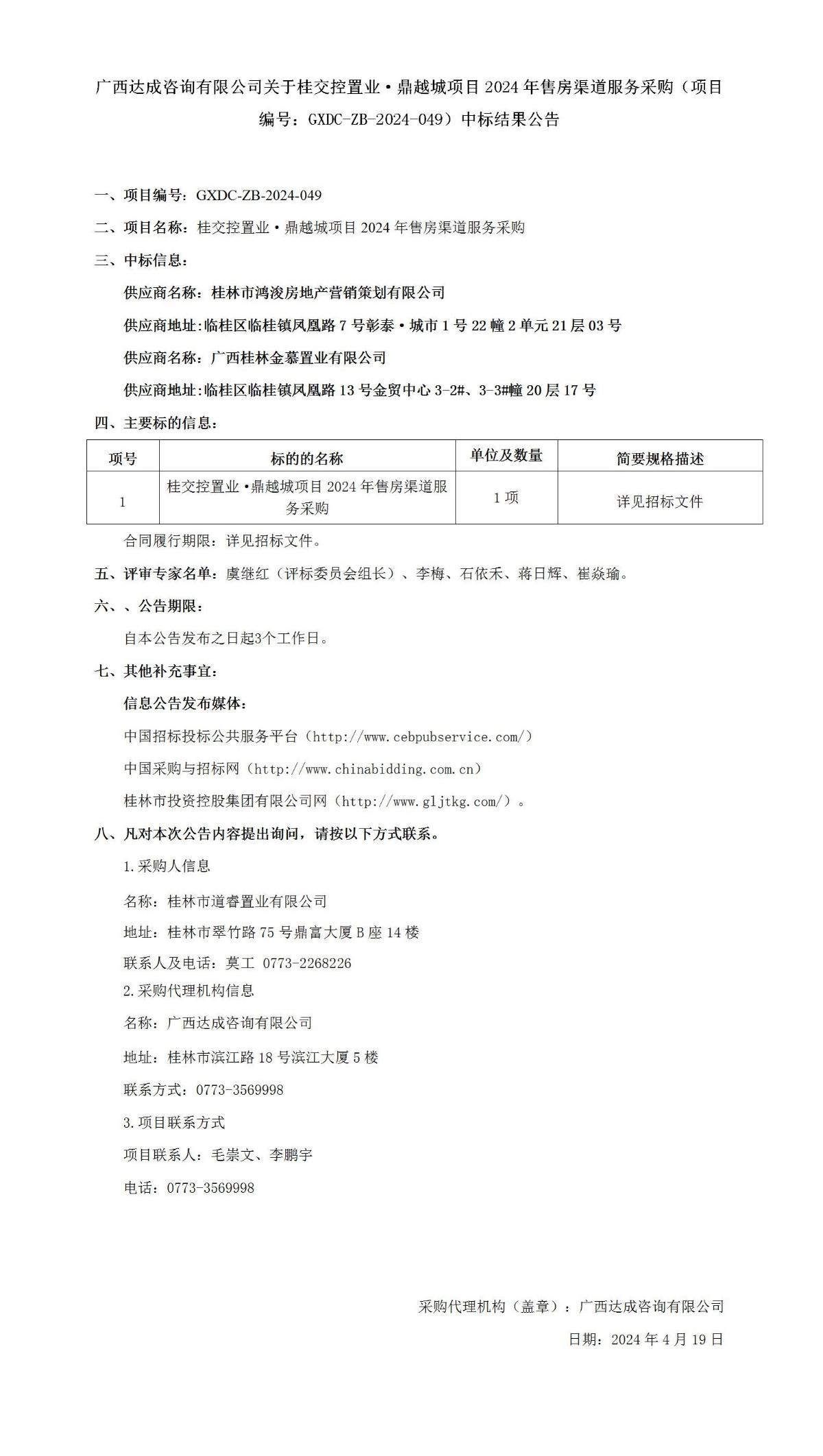 广西告竣咨询有限公司关于桂交控置业·鼎越城项目2024年售房渠道服务采购(项目编号:GXDC-ZB-2024-049)中标效果通告