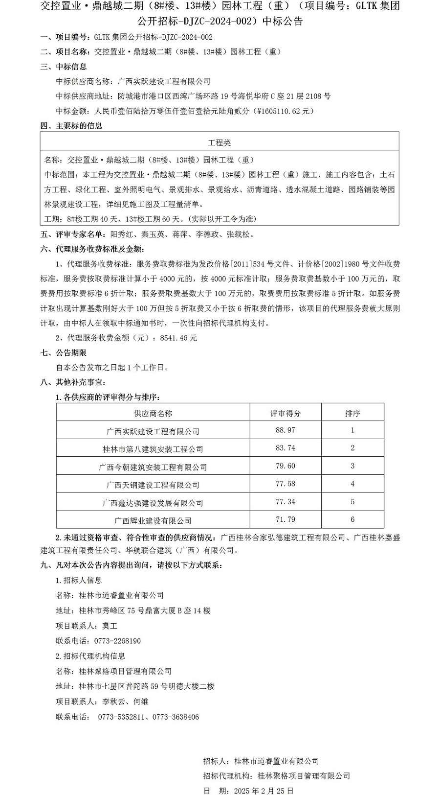 交控置业·鼎越城二期(8#楼、13#楼)园林工程(重)(项目编号:GLTK集团果真招标-DJZC-2024-002)中标通告