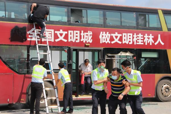 “救命啊,着火了,快来救救我!”6月18日,桂林公交平山场站万福车场一辆满载旅客的公交车浓烟滔滔,“火势”正旺,旅客们在驾驶员的指挥下,迅速、有序撤离“火灾”现场……这是桂林公交2021年突发事务应急处置惩罚实战演练现场。