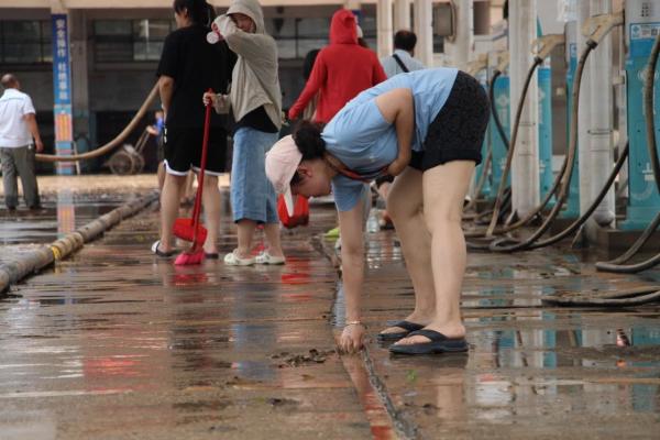 炎炎烈日下,各人边冲边扫,挥汗如雨。有的拿着铲子,一铲铲将淤泥和垃圾铲进垃圾车 ;有的拿着扫把站成一排,喊着号子,程序一致地推着泥水 ;尚有的没有工具,就徒手将排水沟中梗塞的落叶杂物捡出来 ;有的使用抽水机将维修槽里的积水抽出。经由一天的并肩奋战,在当天下昼5点左右,铁西场站终于恢复了原貌。为公交线路周全恢复正常运营夯实了坚实的后勤基础。