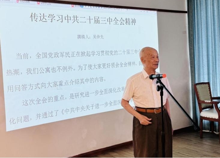 经由一周的全心准备,吴爷爷穿上正装、戴上党徽,容光焕发走上演讲台,为养老院的老同志们撒播党的知识理论,宣讲党的二十届三中全会的重大意义和深远影响。内容富厚、通俗易懂的宣讲方法,让老同志和公寓党员干部们深受教育。