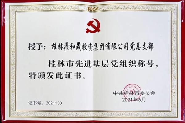 在庆祝中国共产党建设100周年之际,桂林鼎和晟集团党总支被中共桂林市委员会授予“桂林市先进下层党组织”称呼。