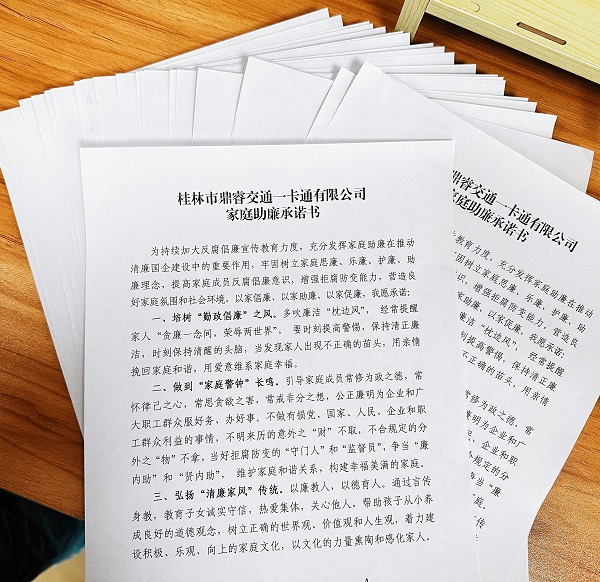 别的,鼎睿一卡通公司还组织全体党员干部签署了《家庭助廉允许书》,要求每位员工不但要在事情中严酷遵守清廉纪律,也要在家庭生涯中树立优异家风,把清廉自律意识融入一样平常生涯中,起劲营造清正清廉的家庭气氛和优异的家教情形,配合守护家庭的幸福与安定。
